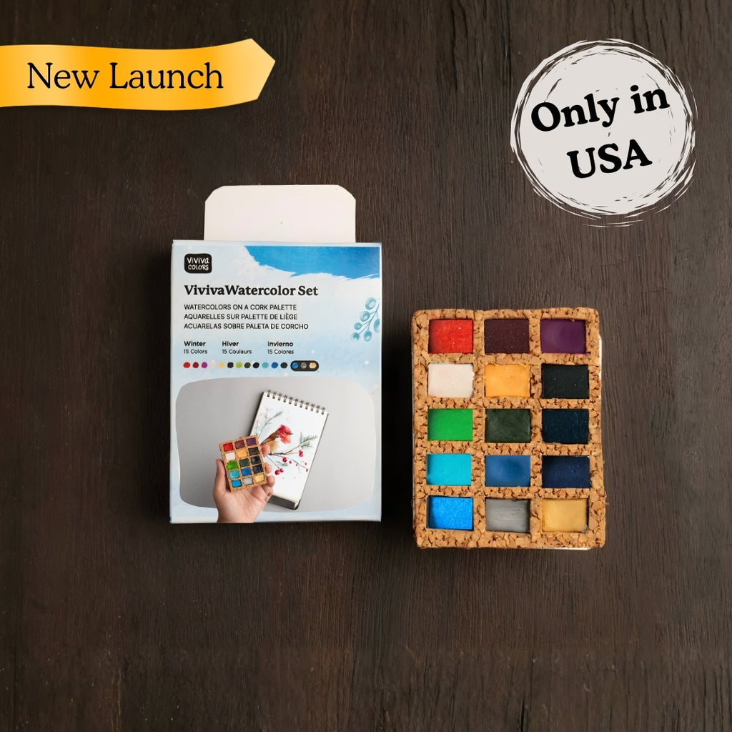 Introducing Viviva Winter Pans — a mini-palette featuring 15 winter-inspired colors that capture the beauty of frosty mornings and starry nights. Think icy blues, cozy browns and metallics — all housed in our signature sustainable cork-based palette✨